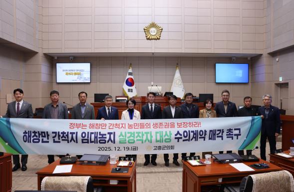 고흥군의회는 12월 19일 열린 제342회 고흥군의회 제2차 정례회 제11차 본회의에서 '해창만 간척지 임대농지 실경작자 대상 수의계약 매각 촉구 건의안'을 의결하고, 해창만 간척지 임대농지를 실경작자에게 수의계약 방식으로 매각할 것을 정부와 관계 부처에 강력히 촉구했다.