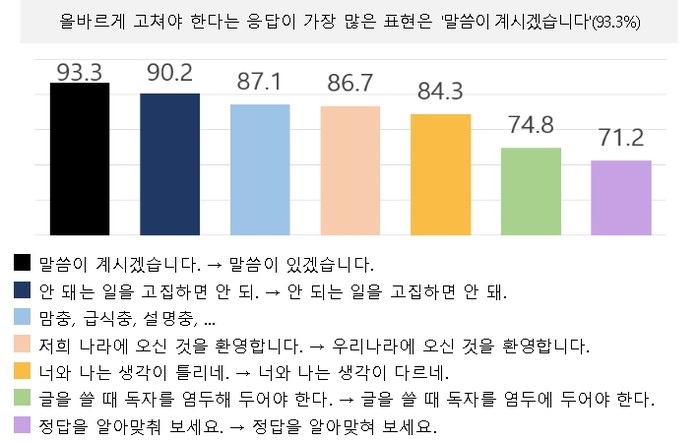 조사 결과 총 30개의 어려운 어휘, 잘못된 표현에 대해 ‘바꿔야 한다고 생각한다’라고 응답한 비율은 평균 61.8%로, 쉽고 바른 말을 사용하자는 응답이 전체적으로 많았다. 특히 13개 항목은 70% 이상, 그중 5개 항목은 80% 이상의 응답자가 바꾸어 써야 한다고 답하는 등 개선 요구가 높게 나타났다.