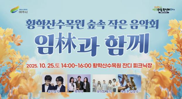 여주시는 오는 10월 25일 오후 2시부터 4시까지 황학산수목원 잔디피크닉장에서 ‘임(林)과 함께’ 음악회를 연다고 밝혔다.