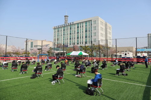 사회적 거리두기가 연장되는 등 코로나19 바이러스의 확산 차단을 위한 범정부적 노력이 지속되고 있는 가운데 서해지방해양경찰청(청장 김도준)이 의무경찰 채용시험을 운동장에서 실시했다.