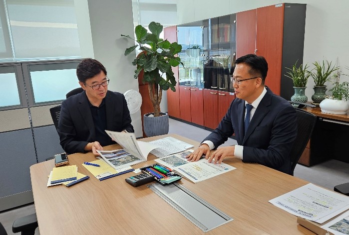 | ▲ 조석훈 목포시장 권한대행(오른쪽)이 정종훈 행정안전부 지방재정국장(왼쪽)에게 특별교부세 건의 사업에 대해 설명하고 있다. |