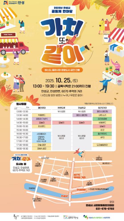 안성시는 오는 2025년 10월 25일, 안성시내 일원(안성교~안성천변~안성천~6070 추억의거리)에서2025 안성시 공동체 한마당 ‘가치 또 같이’ 를 개최한다.
