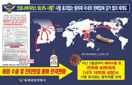 동해해경에 따르면, 코로나바이러스 사멸효과가 증명되지 않은 제품을 마치 상품의 성능이나 효능이 확실하게 발휘하는 것처럼 표시·광고한 혐의(사기, 약칭 화학제품안전법)로 D업체를 붙잡아 조사하고 있다고 28일 밝혔다.