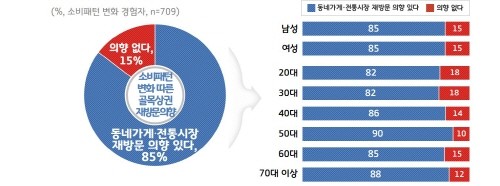 특히 위와 같은 소비패턴 변화 경험자(709명)의 85%는 경기도 재난기본소득 사용을 위한 목적이 아니더라도 동네가게나 전통시장을 ‘재방문할 의사가 있다’고 응답해 주목된다. 경기도 재난기본소득이 코로나19 기간 중 자영업자 매출증대에 영향을 줄 뿐만 아니라, 신규고객 유입 등 지속가능한 골목상권 활성화에도 효과가 있음을 보여주는 결과라고 도는 설명했다.