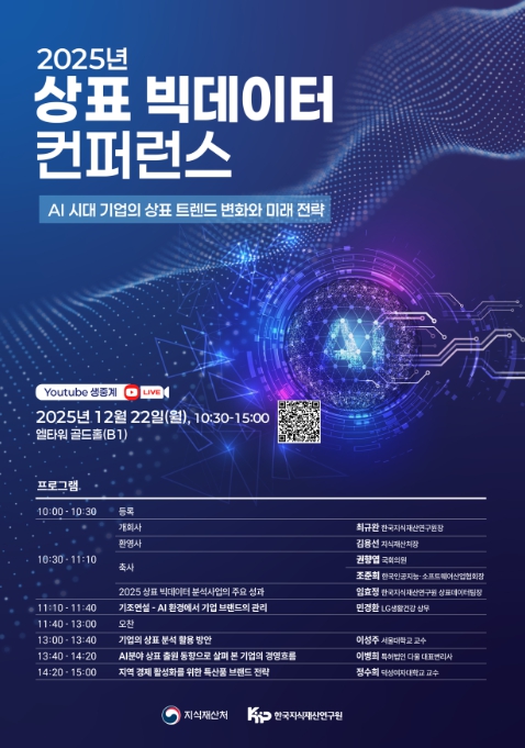 지식재산처가 주최하고 한국지식재산연구원이 주관하는 ‘2025년 상표 빅데이터 학술회의’가 12월 22일 10시 30분 엘타워 골드홀(서울 서초구)에서 개최된다.