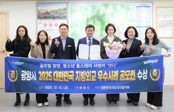 광양시는 지난 12일 대한민국시도지사협의회가 주관한 ‘2025 전국 지방외교 우수사례 공모전’ 본선에서 국제 청소년 홈스테이 사업이 ‘장려상’을 수상했다고 밝혔다.