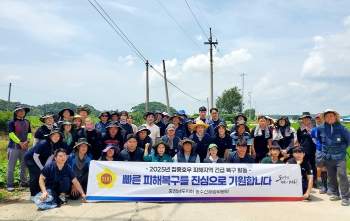 지난 23일 진행된 복구작업에는 농수산해양위원회(위원장 이연희)와 도의회 4개 담당관실(의사.홍보.입법.예산), 충남도 농업기술원, 수산자원연구소 수산물안전성센터 등 직원 60여 명이 참여했으며, 집중호우로 물에 잠긴 가옥 가전제품, 생활용품 등을 정리하고 하천변 쓰레기를 수거하는 등 구슬땀을 흘렸다.