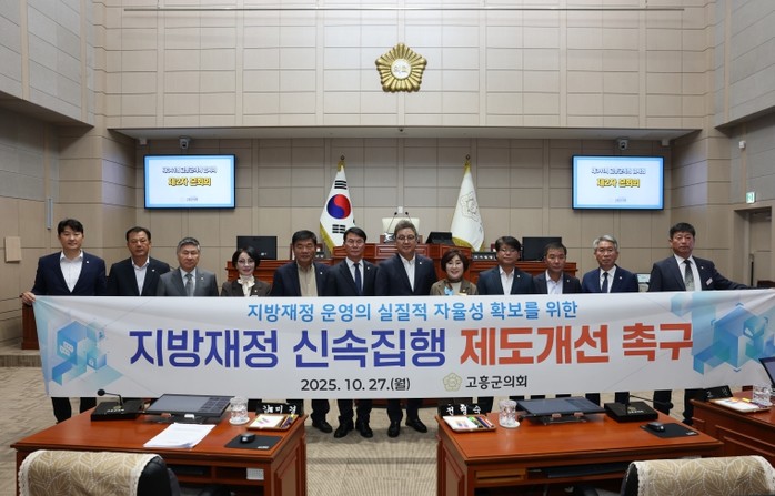 고흥군의회 10월 27일 제341회 임시회 제2차 본회의에서 '지방재정 신속집행 제도개선 촉구 건의안'을 의결하고, 지방자치단체의 자율성과 행정 효율성을 저해하는 신속집행 제도의 전면적인 개선을 중앙정부에 강력히 촉구했다.