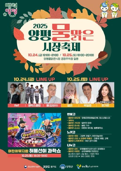 양평물맑은시장의 대표 축제인 ‘2025 양평물맑은시장 축제’가 오는 10월 24일부터 25일까지 양평물맑은시장 공영주차장에서 열린다.