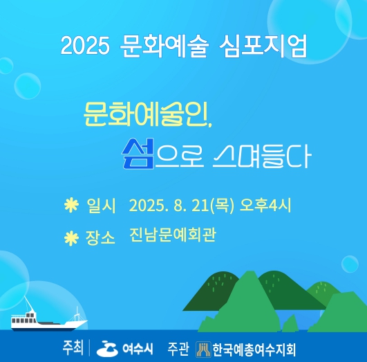 여수시는 오는 8월 21일 오후 4시 진남문예회관에서 ‘2025년 문화예술심포지엄(1차) – 문화예술인, 섬으로 스며들다’를 개최한다고 밝혔다.