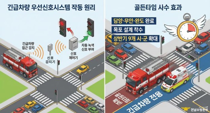 전남소방은 지난 2025년 총사업비 5억 원을 투입해 ▲담양군 ▲무안군 ▲완도군 등 3개 군의 12개 교차로, 총 4.3km 구간에 해당 시스템 설치를 완료하고 현재 운영 중이다.