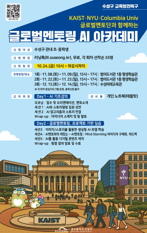 대구 수성구는 오는 11월 7일 범어도서관 김만용·박수년홀에서 ‘글로벌 교육 전문가와 함께하는 수성 AI 인재 미래교육 포럼’을 개최하고, 연계 프로그램인 AI 아카데미를 통해 미래세대를 위한 교육혁신과 글로벌 협력의 출발점을 연다.