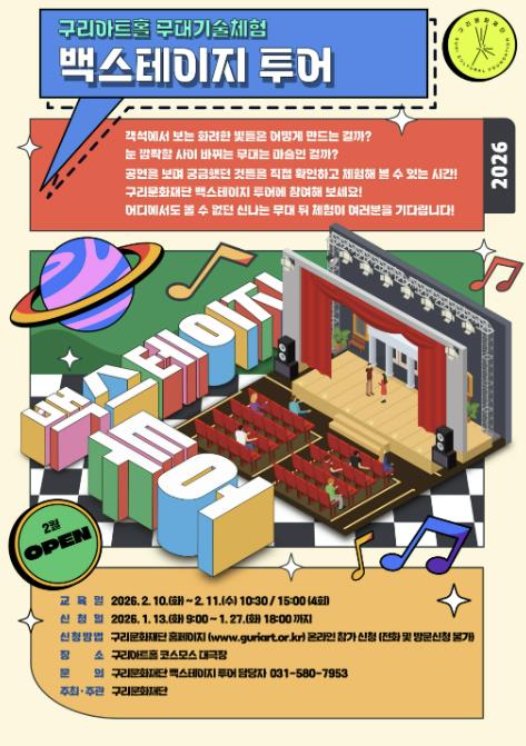 구리문화재단은 〈무대 기술 체험 백스테이지 투어 프로그램〉 참가자를 오는 1월 13일 오전 9시부터 1월 27일 오후 6시까지 재단 홈페이지를 통해 선착순 모집한다고 밝혔다.
