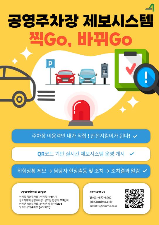 안성시시설관리공단은 10월 10일부터 원곡면, 석정동, 공도 저류지, 동본동(수탁예정)공영주차장 4개소 대상으로, 이용객이 직접 주차장의 위험요소나 이용 불편사항을 손쉽게 제보하고 개선에 참여할 수 있는 QR 코드 기반의 실시간 위험상황 제보시스템 “찍Go, 바뀌Go”를 운영한다고 밝혔다.