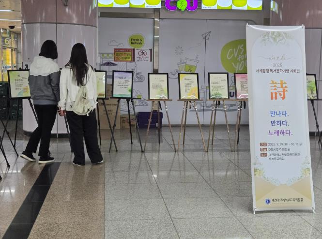 대전서부교육지원청은 9월 29일부터 10월 17일까지 대전시청역 대합실(대전 서구 둔산중로 55)에서 2025학년도 사제동행 독서문학기행 참가자 28명의 시화 작품 전시회 '詩-만나다. 반하다. 노래하다.'