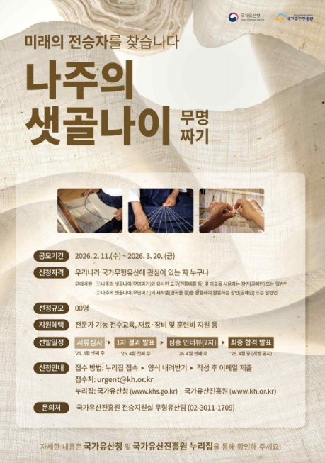 국가유산청은 국가유산청 산하 국가유산진흥원과2월 11일부터 3월 20일까지 단절 위기의 국가긴급보호무형유산인 '나주의 샛골나이(무명짜기)'의 미래 전승자 발굴을 위한 공모를 진행한다.