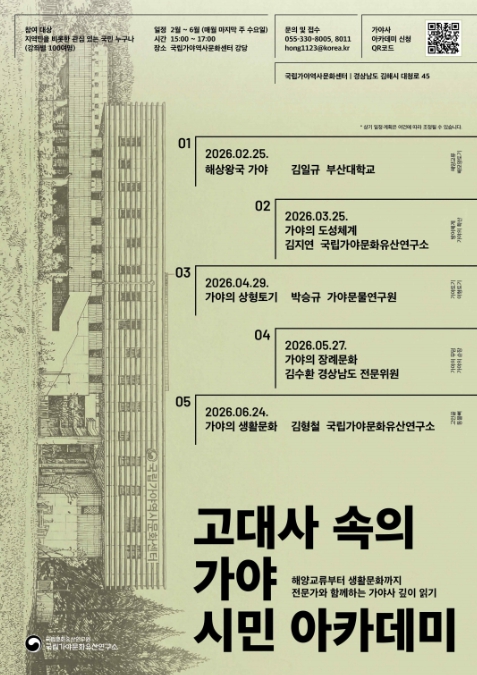 국가유산청 국립문화유산연구원 국립가야문화유산연구소는 2월부터 6월까지 매월 마지막 주 수요일, 국립가야역사문화센터 강당(경남 김해시)에서 시민들을 대상으로 '고대사 속의 가야' 시민 아카데미를 개최한다.