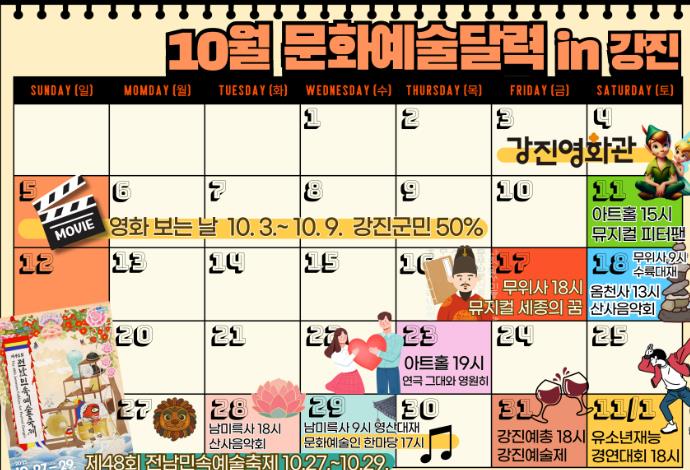 강진군은 선선한 가을바람과 함께 군민의 문화적 감수성을 채워줄 다채로운 문화예술 행사를 10월 집중 운영한다고 29일 밝혔다.
