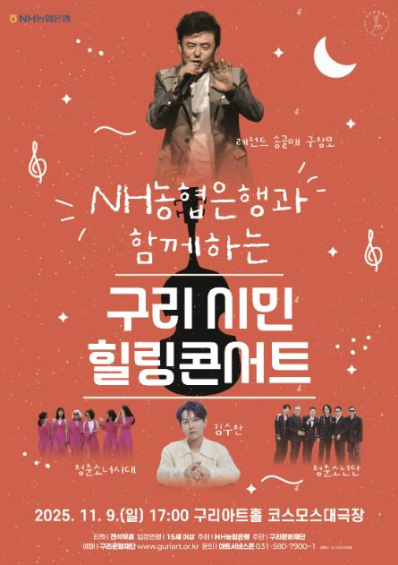 구리문화재단이 주관하고 NH농협은행 구리시지부가 주최하는 'NH농협은행과 함께하는 구리 시민 힐링 콘서트'가 오는 11월 9일 오후 5시, 구리아트홀 코스모스 대극장에서 열린다.