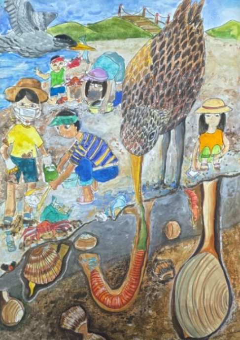 | ▲ 2025 해양생물 콘텐츠 공모전 수상작(해양사랑상(대상) 그림부문 '갯벌생태계를 지키는 우리의 손길') |