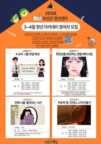 보성군은 청년들의 역량 강화와 정서적 안정을 지원하기 위해 오는 13일까지 ‘2026년 1차 보성군 청년 아카데미 프로그램’ 참가자를 모집한다고 밝혔다.