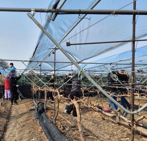 | ▲ 9일 영천시 공무원들이 습설 피해 포도 농가에서 비가림 시설 비닐 복구 작업을 하고 있다. |