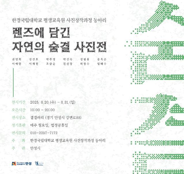 한경국립대학교 평생교육원 사진창작과정 동아리 회원들이 오는 8월 20일부터 8월 31일까지 안성천 작은미술관 결갤러리에서 '렌즈에 담긴 자연의 숨결'이라는 주제로 단체전을 개최한다.