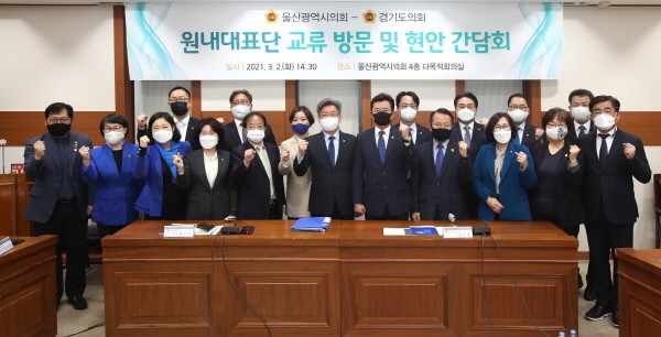 울산시의회에서는 백운찬 원내대표를 비롯한 민주당 의원 17명 대부분이 참석하여 경기도의회 더불어민주당 수석대표단을 환대했다.