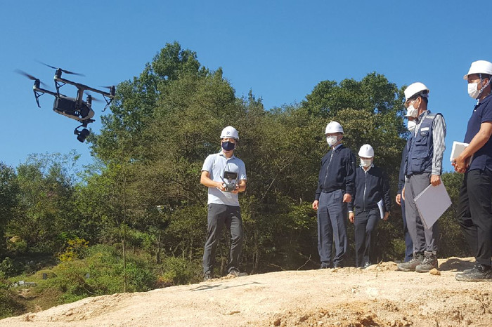 | ▲ 공단 안전감사실 직원들이 드론을 활용한 공사현장 안전점검을 실시하고 있다. |