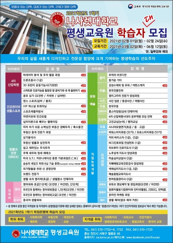 나사렛대 평생교육원, 2021학년도 1학기 학습자 모집