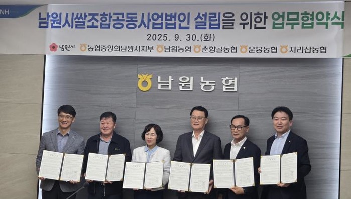 남원시는 이번 9월 30일 남원농협에서 농협쌀조합공동사업법인 설립을 위해 남원시(남원시농업기술센터소장), 농협중앙회남원시지부, 남원농협, 춘향골농협, 운봉농협, 지리산농협과 업무협약식을 개최했다.