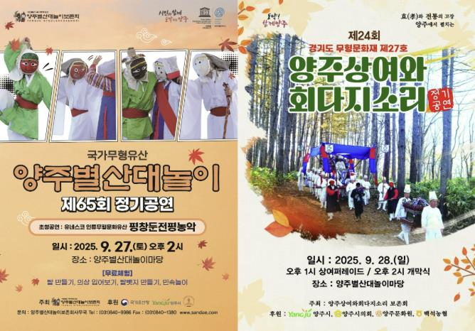 양주시가 오는 9월 27일과 28일 이틀간 양주별산대놀이마당에서 지역 대표 무형유산 정기공연을 연이어 개최한다.