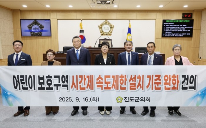 진도군의회는 9월 16일에 열린 제310회 진도군의회 임시회에서 '어린이 보호구역 시간제 속도제한 설치 기준 완화 촉구 건의안'을 채택했다고 밝혔다.