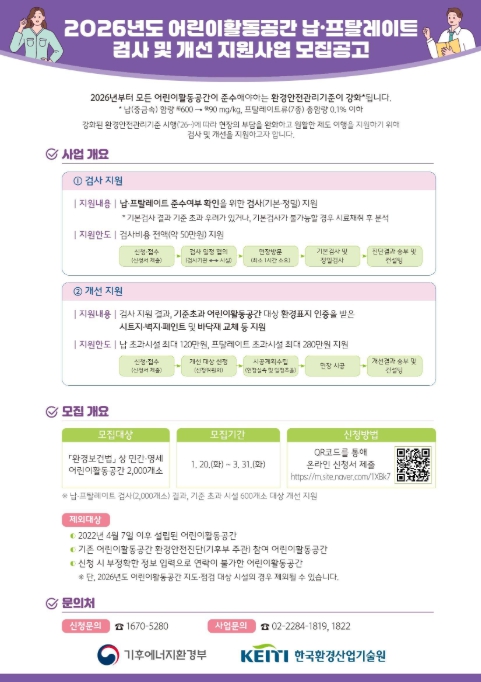 | ▲ '2026년도 어린이활동공간 납·프탈레이트류 검사 및 개선 지원사업 모집공고' 안내문 |