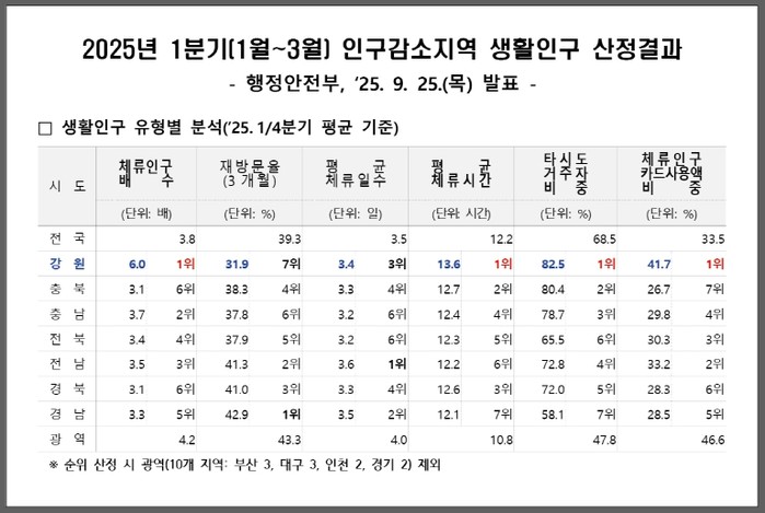 강원특별자치도는 행정안전부가 9월 25일 발표한 ‘2025년 1분기 인구감소지역 생활인구 산정 결과’에서 체류인구 총 2,826,012명으로 전국 최고 수준을 기록했다고 밝혔다.