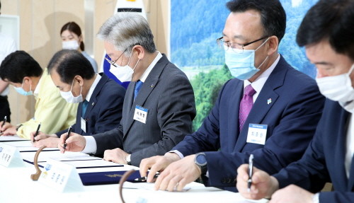이재명 경기도지사와 박윤국 포천시장, 최용덕 동두천시장, 김광철 연천군수, 조학수 양주부시장, 최종원 한강유역환경청장은 25일 경기북부청사에서 이런 내용을 담은 ‘한탄강 색도 개선을 위한 협약서’에 공동 서명했다.
