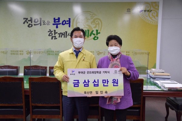 임인숙씨는 “항상 인정을 베풀고 살라는 어머님의 유지를 받들어 조금씩 모았던 돈이 작은 금액이지만 우리 지역 어려운 학생을 위한 장학 사업에 힘을 보탤 수 있어 기쁘다”며 “부여의 미래를 책임질 학생들이 학업에 전념할 수 있기를 바란다”고 소감을 밝혔다.