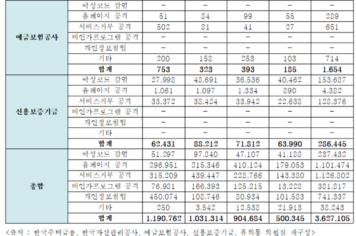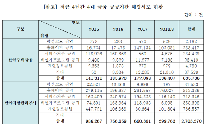 (이슈타임)김혜리 기자=4대 금융 공공기관에 대한 해킹시도 건수가 최근 4년간 363만건에 달하는 것으로 나타났다.
