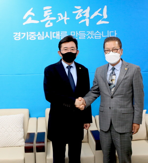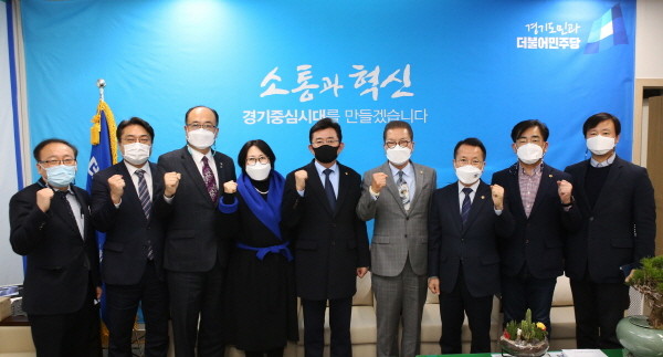 경기도의회 더불어민주당(대표의원 박근철, 의왕1)은 2일(수) 교섭단체 선진 운영사례 벤치마킹을 위해 방문한 전라남도의회 더불어민주당 이장석 대표의원 및 사무처 직원들과 함께 정담회를 진행했다.