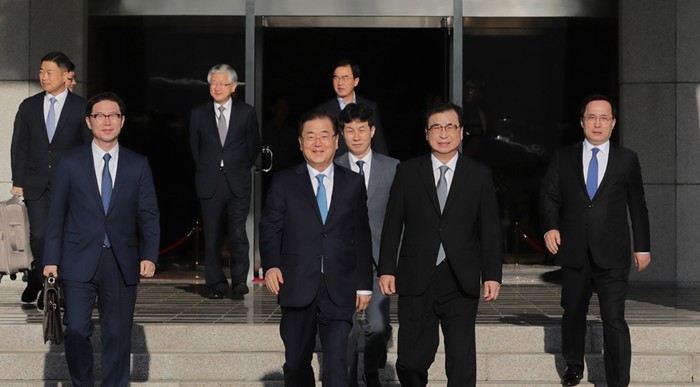 정 수석은 `북미 사이에 종전선언에 대한 공감대가 있는지`에 대한 질문에 "한반도 평화 정착을 추진해나가는 과정에서 종전선언은 매우 필요한 과정"이라며 "금년 중에 종전선언이 이뤄지도록 계속 노력할 것"이라고 말했다.