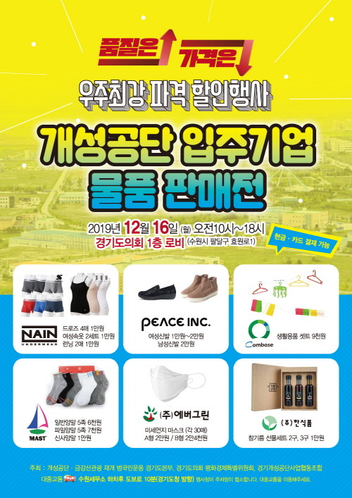 물품판매전에는 개성공단 입주기업들이 생산한 속옷세트, 남·여 신발, 생활용품 세트, 양말세트, 미세먼지 마스크, 참기름 선물세트 등 다양한 제품이 선보인다. 이날 판매되는 물품들은 좋은 품질에 6천원~2만원대의 저렴한 가격으로 만날 수 있다.