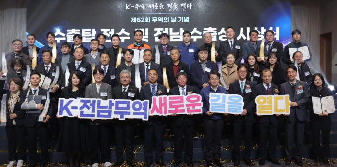 전라남도는 제62회 무역의 날을 기념해 수출탑 전수식과 전남 수출상 시상식을 지난 17일 호텔현대 바이 라한 목포에서 열어 전남 수출 성과를 공유하고 지속적인 수출 확대 방안을 모색했다.