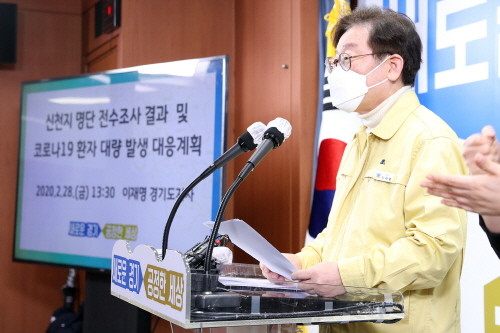 이재명 경기도지사는 28일 경기도청에서 긴급 기자회견을 열고 경기도 입수 신천지 신도 명단 전수조사 결과를 공개하고 경기도의 대응계획에 대해 설명했다.