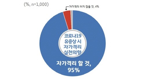 발열 및 기침 등의 호흡기 증상으로 코로나19 의심 증상이 느껴질 경우, 정부의 조치가 없더라도 스스로 등교, 출근, 외출을 하지 않는 자가격리를 하겠다는 응답이 95%에 달했다.