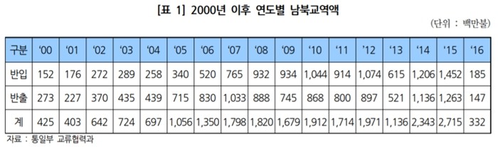 지난 1989년 시작 이래로 남·북 교역은 성장 추세가 지속됐다. 특히 개성공단의 경우 남·북 교역액은 지난 2000년 4억2500만 불을 시작으로 지난 2015년에는 27억1500만 불로 늘어나면서 역대 최고치를 기록했다.