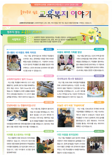 ‘들려주고 싶은 교육복지 이야기’는 교육복지우선지원사업의 일환으로 운영하는 다양한 활동과 프로그램을 공유해 교육가족 및 지역사회의 관심과 참여를 이끌어내기 위해 연 2회 발간되는 소식지다.