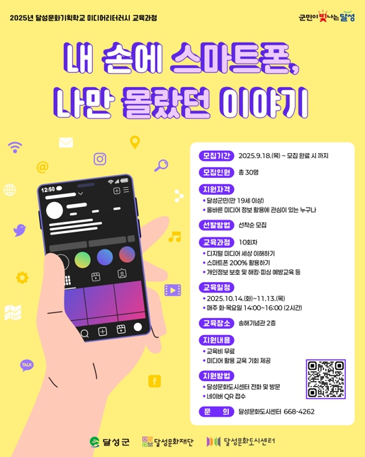 (재)달성문화재단 달성문화도시센터는 10월 14일부터 11월 13일까지 선비체험관(송해기념관) 2층에서 ‘미디어리터러시 교육과정 – 내 손에 스마트폰, 나만 몰랐던 이야기’를 진행한다.