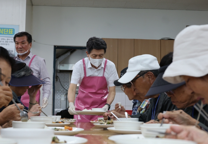 이강덕 포항시장이 2일 추석을 앞두고 무료급식소 ‘만나의집’을 방문해 어르신 200여 명에게 배식 봉사를 하며 감사의 마음을 전했다.