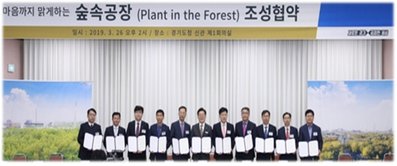 원활한 사업 추진을 위해 경기도는 작년 3월 삼성전자, 기아자동차, SK하이닉스 등 도내 121개 기업과 ‘숲속공장 조성 협약’을 체결한 바 있다.