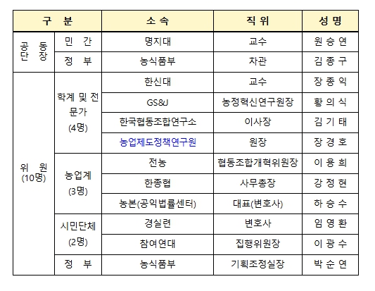 ‘농협 개혁 추진단’은 명지대 원승연 교수와 농식품부 김종구 차관이 공동단장을 맡는 민·관 합동 논의기구로, 농업계와 시민사회 분야, 협동조합·금융·법률 분야의 전문성을 갖춘 12명의 위원(단장 포함)으로 구성됐다.
